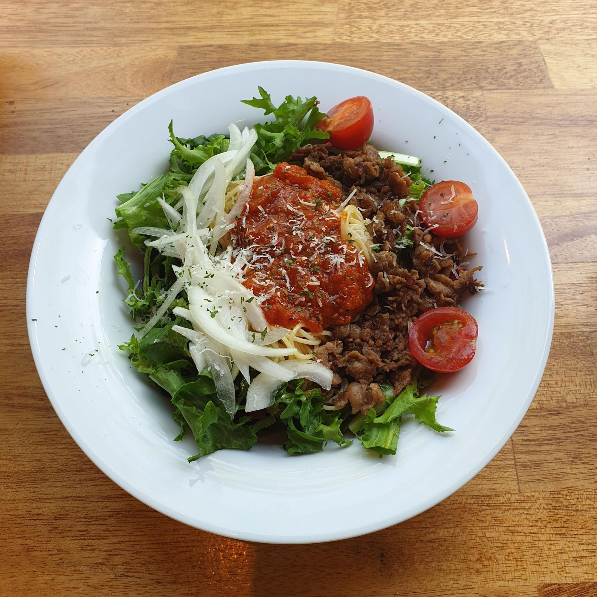 불고기와 양파 채소들, 그리고 얇은 면 위에 이 곳에서 직접 만든 토마토소스가 올라간다.